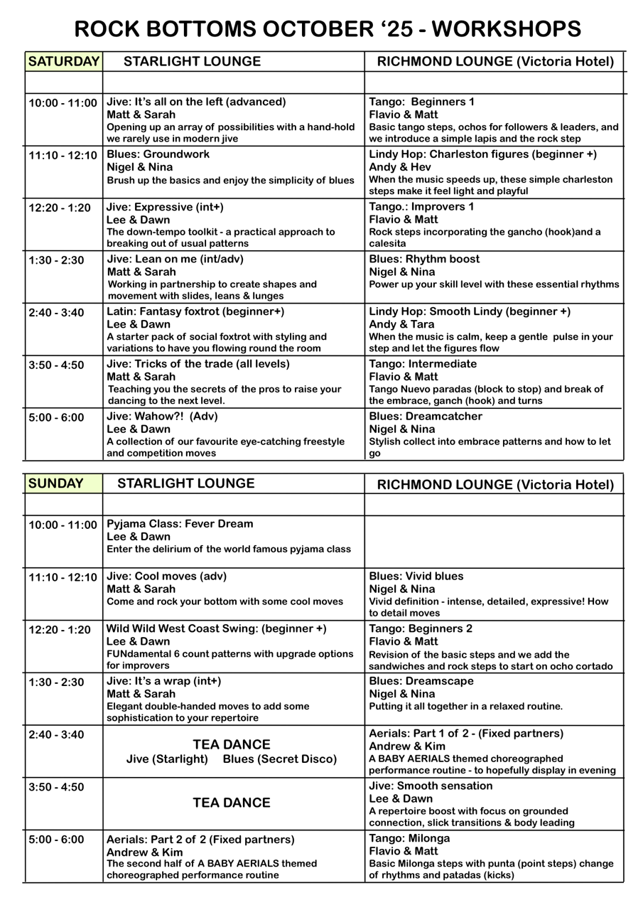 Workshops run continuously between 10am and 6pm on both Saturday and Sunday. The majority of these workshops will be Tango at beginner, intermediate and advanced levels.